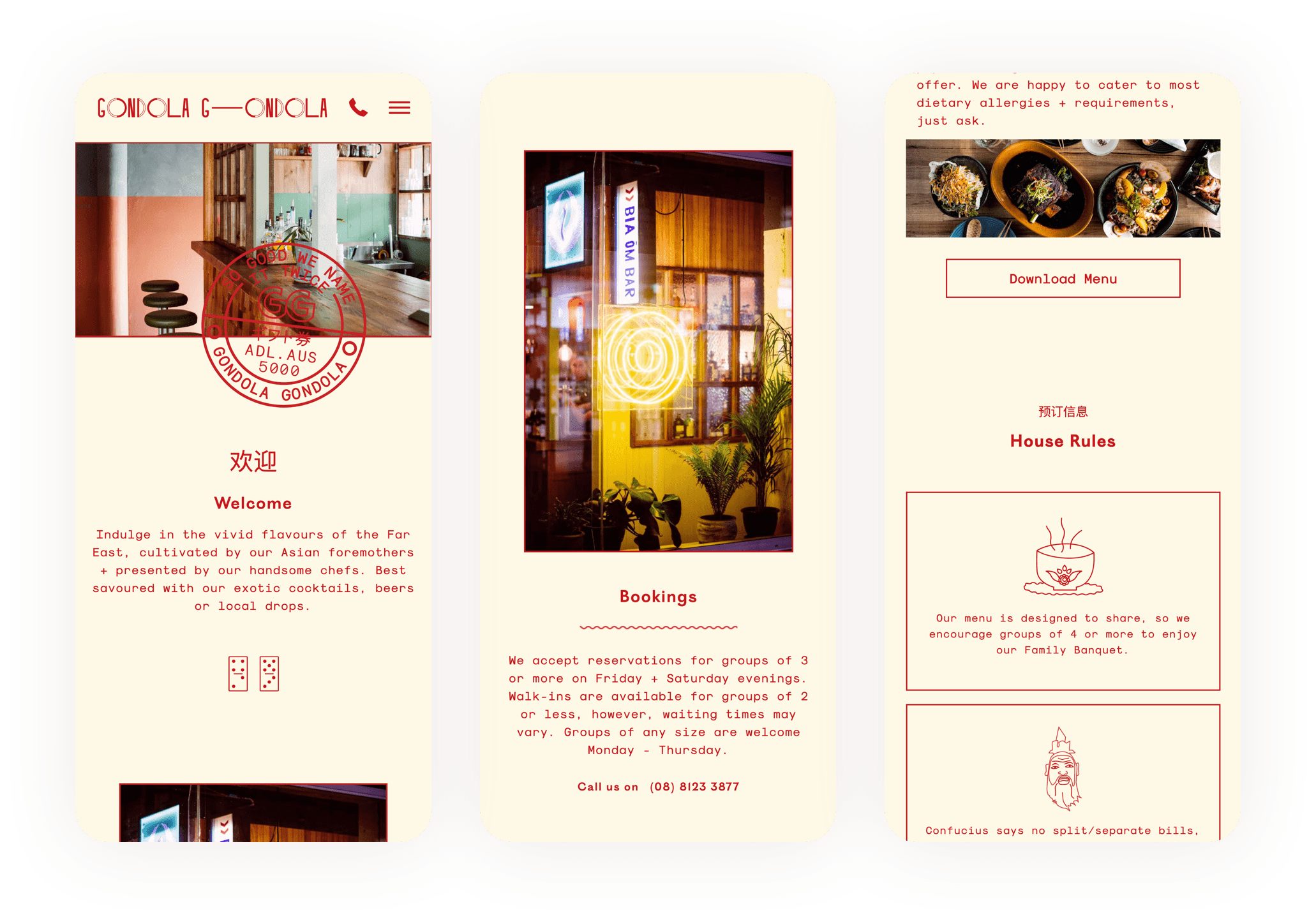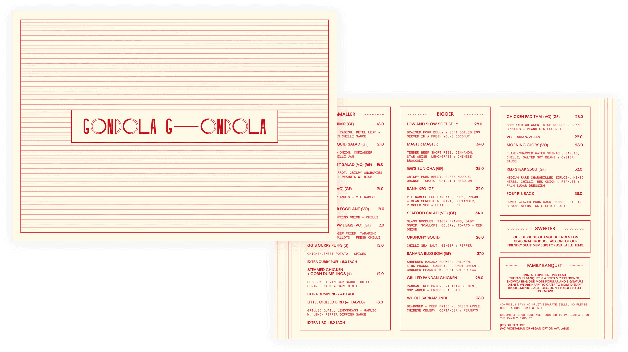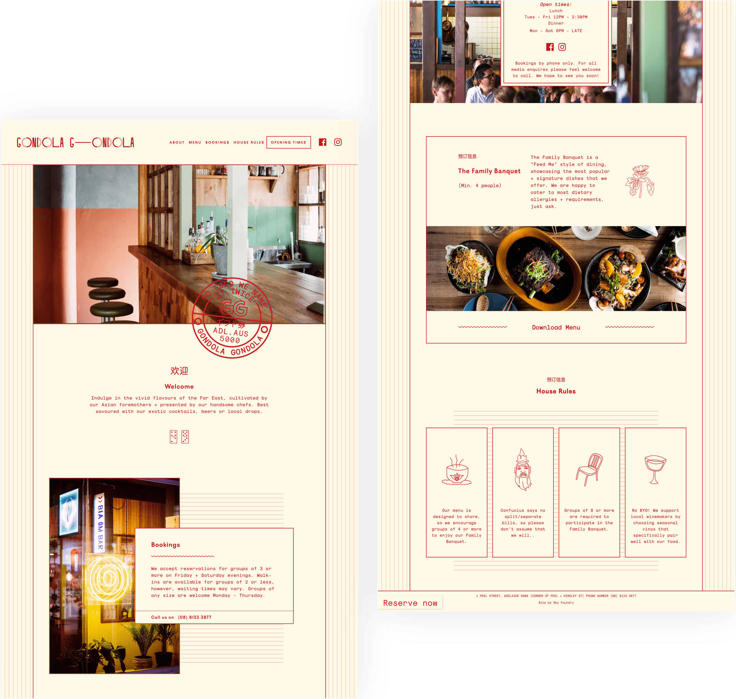 During the fit-out design process, Matiya (GG interior designer) decided to break the restaurant up into different sections. Most prominently, he has built a whole structure at the front of the space which looks like a hut and functions as a bar and kerb for you to wait at before being seated at your table - we saw this as a window into the world of Gondola Gondola which we visually communicated through the linework border-style surrounding the design of the website and menus.